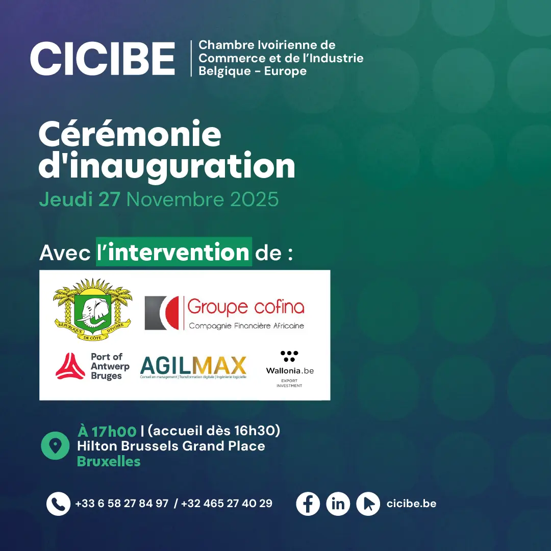 La Chambre ivoirienne de Commerce et de l’Industrie Belgique (CICIBE) a le plaisir de vous annoncer la tenue de sa cérémonie officielle d’inauguration le jeudi 27 novembre prochain, à Bruxelles.